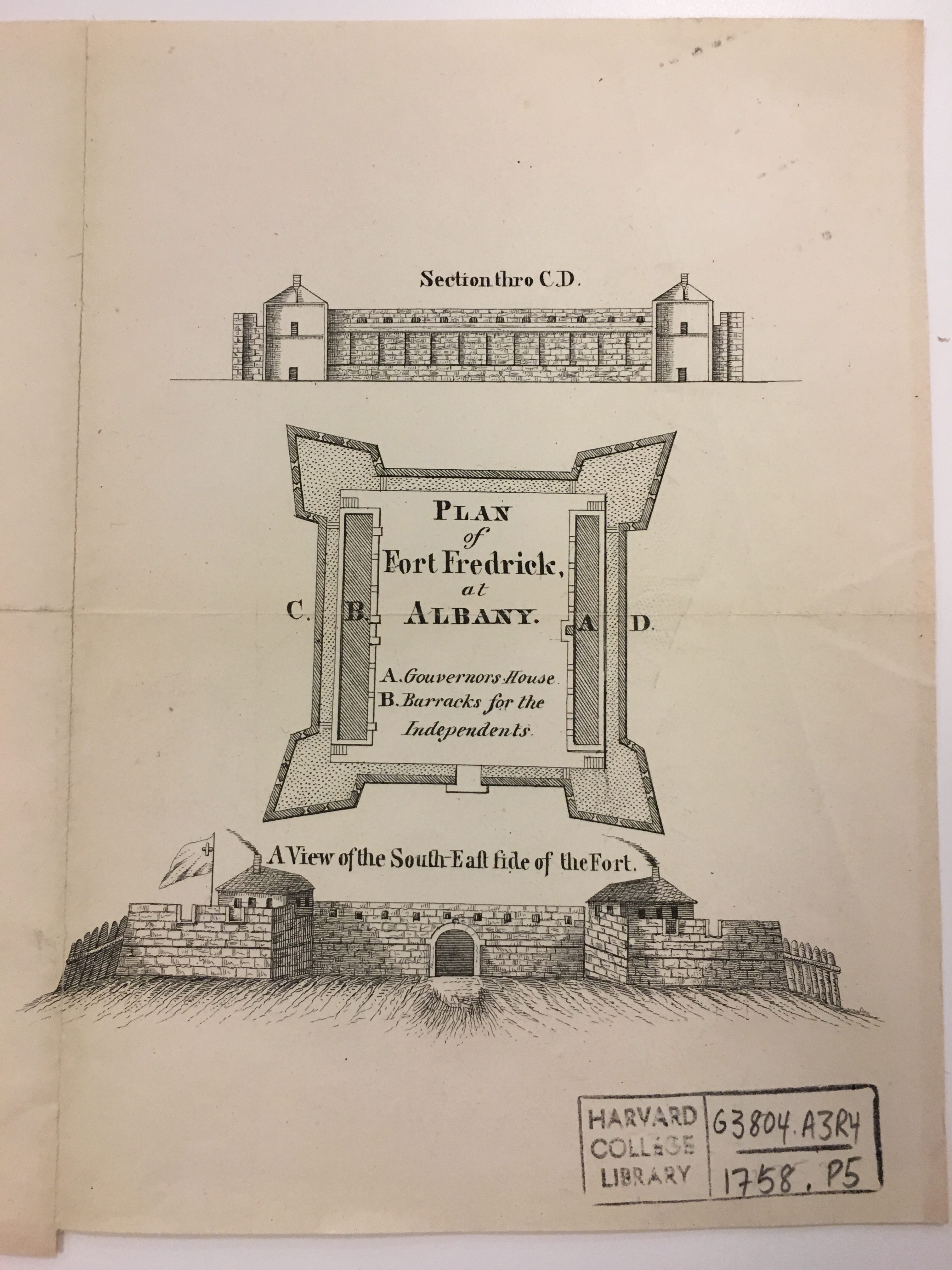 A layout of the city plan of Albany, particularly including military fortifications. Includes a map of Albany's central fort, Fort Frederick.