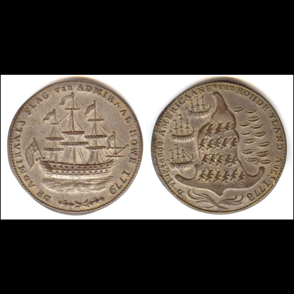 A British medal with Dutch inscriptions depicting the Battle of Rhode Island. The medal was struck as a manner of propoganda, attempting to dissuade the Dutch from joining the Treaty of Armed Neutrality.